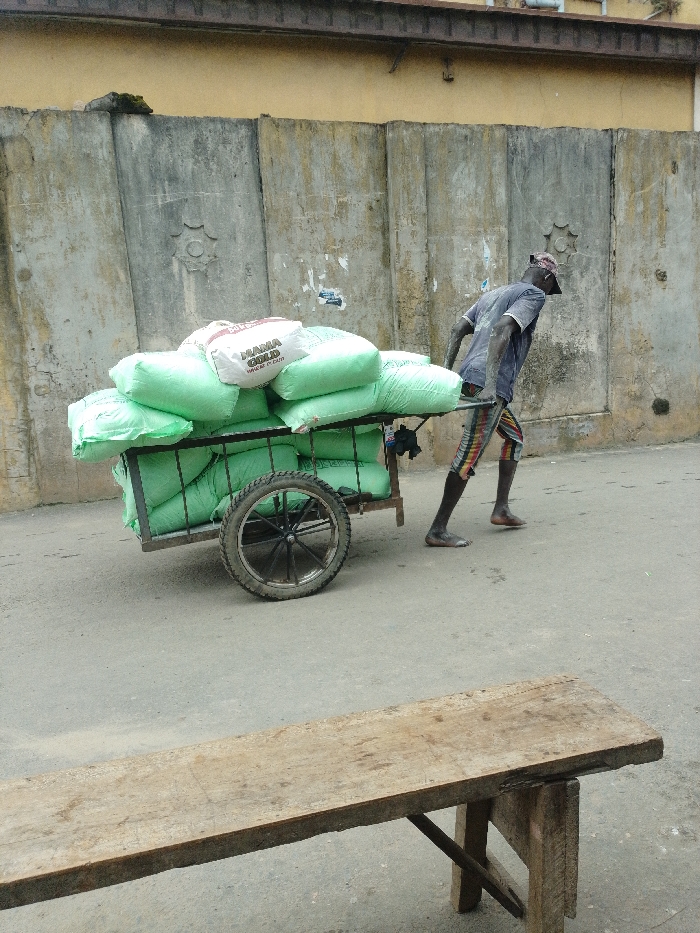 An adult male, barefoot and wearing a soiled dark blue t-shirt, multi-colored striped shorts, and a dark cap, is depicted pushing a two-wheeled metal handcart laden with numerous sacks. The majority of the sacks are light green; one white sack on top is clearly marked "MAMA GOLD" and "MADE IN NIGERIA." The man leans forward, exerting effort to move the cart along a gray paved road. The background consists of a tall, weathered concrete wall with visible discoloration, cracks, and a circular relief design. Above this wall, a portion of a building with a yellowish-tan facade and a dark brown roofline is visible. In the immediate foreground, a rough wooden bench with plank seating and simple wooden supports is partially visible, extending from the lower left towards the center. The scene is located in the city of Agani, Nigeria.