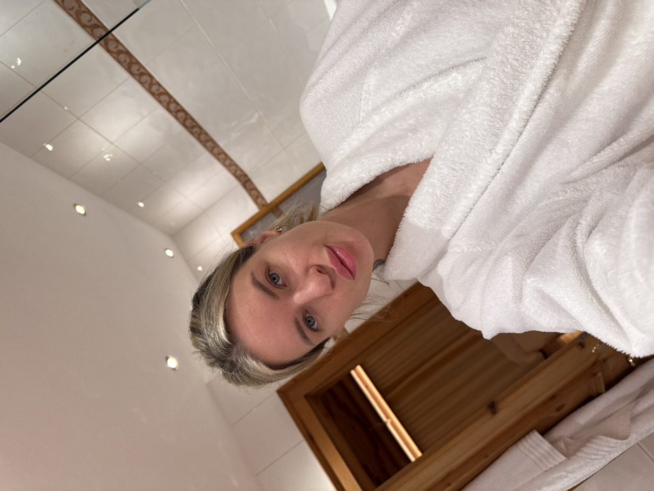 A woman in a white robe poses for a selfie in a bathroom. The room features a mirror with decorative trim, tiled walls with recessed lighting, and a wooden sauna or storage unit. Her blonde hair is pulled back. She has fair skin, blue eyes, and pink lips. She's looking directly at the camera with a slight smile.