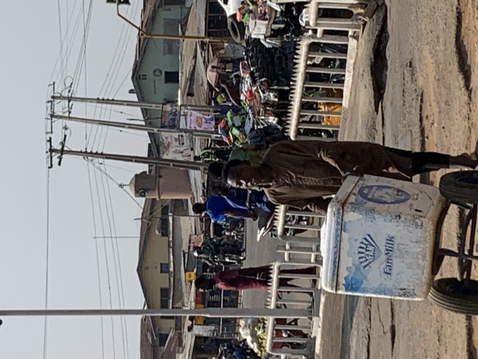 The image captures a bustling street scene in Oyo, Nigeria, under clear daylight conditions. In the foreground, a young male, dressed in a long brown tunic over dark trousers and wearing sandals, pushes a white, rectangular "Fan Milk" branded cooler mounted on a two-wheeled cart. He is positioned slightly right of center, moving forward on a deteriorated asphalt road featuring multiple cracks and potholes. To the immediate left and right of the central figure, light-colored metal barriers delineate the roadway. Beyond these barriers, the scene unfolds into a busy urban environment. On the left, several individuals are present, including a male in a red shirt walking left and another in a blue shirt standing. Further back, a person on a motorcycle with a camouflage-patterned helmet is visible. A street vendor displays produce, appearing to be plantains, on a stall. In the mid-ground, two tall, weathered utility poles heavily strung with multiple power lines dominate the skyline against a pale, clear sky. Behind them, a distinctive light brown cylindrical structure, possibly a mosque minaret or clock tower, with a pointed roof and finial, stands out. To the right of the utility poles, a dense open-air market stall is visible, characterized by a large accumulation of diverse goods, including what appears to be electronics, plastics, and other miscellaneous items, piled high behind more metal barriers. A vendor operates under a dark umbrella within this market area. The background features numerous single-story and two-story buildings with corrugated metal roofs, indicative of an urban setting. One building on the right has a light green facade with a star-shaped emblem. The overall environment suggests a dynamic urban marketplace with ongoing pedestrian, vending, and light vehicular activity.