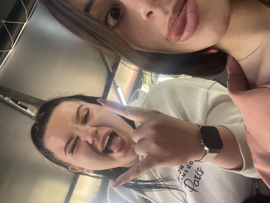 This image depicts two individuals in a close-up, selfie-style photograph, situated within an indoor or covered outdoor environment in Tvarditsa, Bulgaria. The individual on the left, a female, has dark hair pulled back. She is captured with an open mouth, tongue partially extended, and eyes squinted. Her right hand displays a "rock on" gesture, with the index and pinky fingers extended, and features long pink fingernails. She wears a light-colored hooded sweatshirt with visible text including "Paris" and a silver-toned smartwatch with a dark face on her left wrist. The individual on the right, partially visible from the right side of the face, presents a wide-open right eye and an extended tongue. This individual wears a light pink or coral-colored garment and a thin silver-toned necklace. A red reflection or earring is visible near her ear. The background consists of an overhead grey ceiling structure with visible lines and indistinct lighting fixtures.