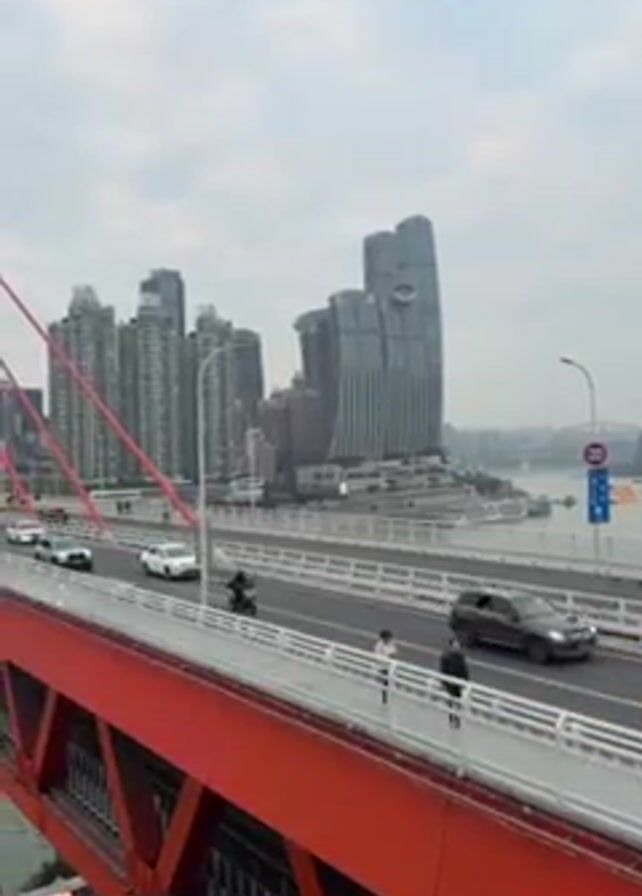 cityscape with a red and white bridge in the foreground. The bridge has traffic on it, including cars and a motorcycle. People are also walking on the bridge. In the background, there are tall buildings and a river. The sky is cloudy.