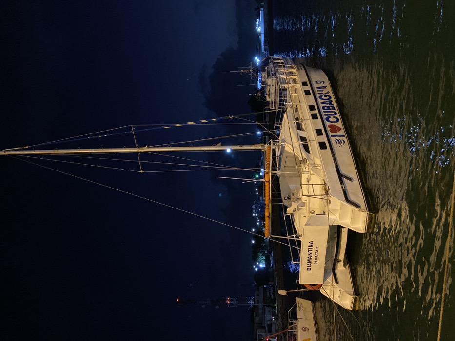 The image depicts a white catamaran moored in the water at night in the city of Punta de Piedras, Venezuela