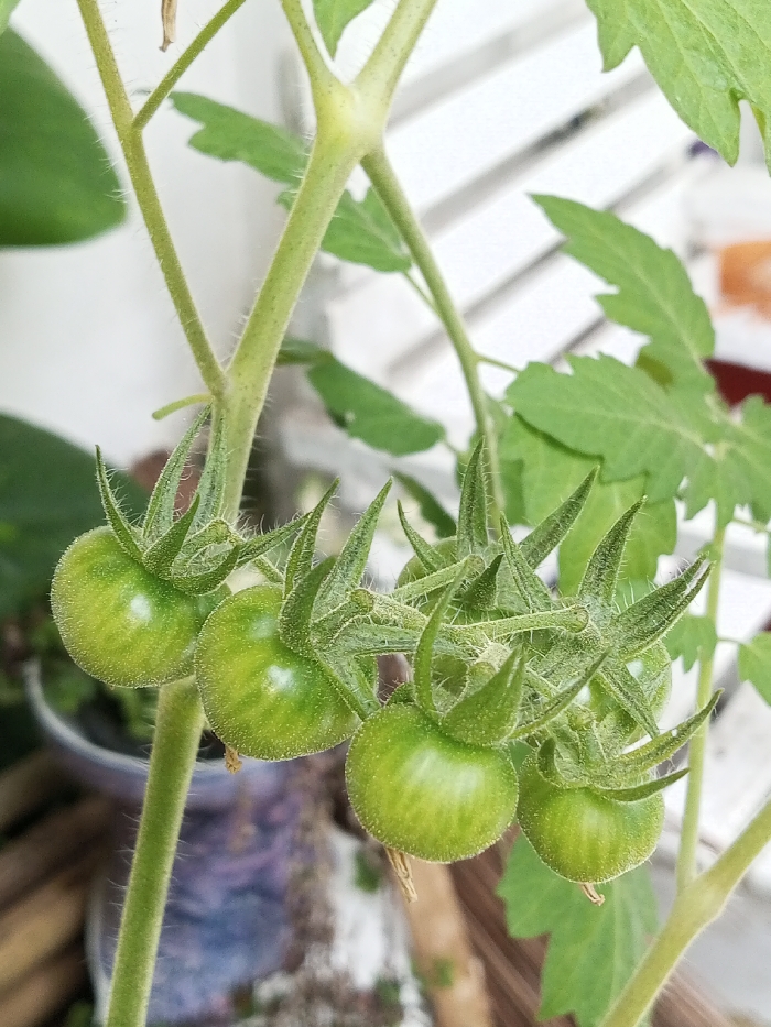 A close-up shot reveals a cluster of four unripe, green tomatoes hanging from a vibrant green tomato plant. Each tomato is round and slightly fuzzy, with dark green stripes running vertically down its surface. The plant's stem is covered in tiny white hairs. In the background, blurry foliage, a white fence, and the side of a pot are visible, suggesting the plant is growing in a garden or balcony setting.