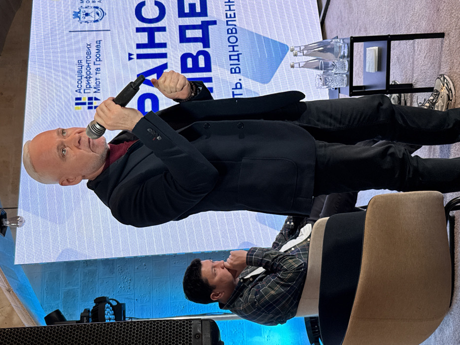 The image depicts an indoor event in Mykolaiv, Ukraine, indicated by the Mykolaiv Oblast Military Administration emblem visible on a background screen