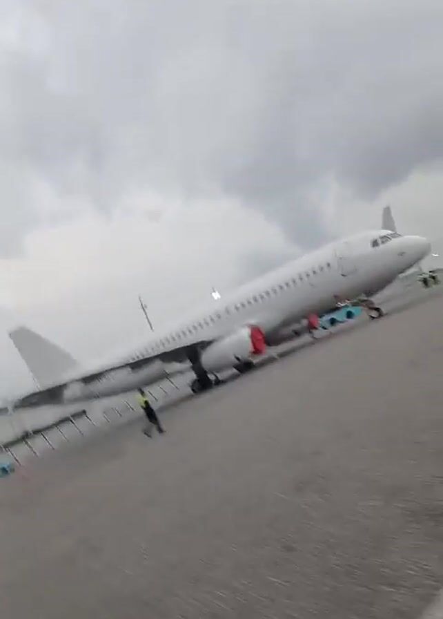 n exterior view of what appears to be an airport tarmac. Several airplanes are visible on the ground, mostly painted white. Personnel in reflective vests are working around the planes. The sky is overcast and the tarmac is gray. The camera moves, showing different angles of the airplanes and the surrounding airport buildings.