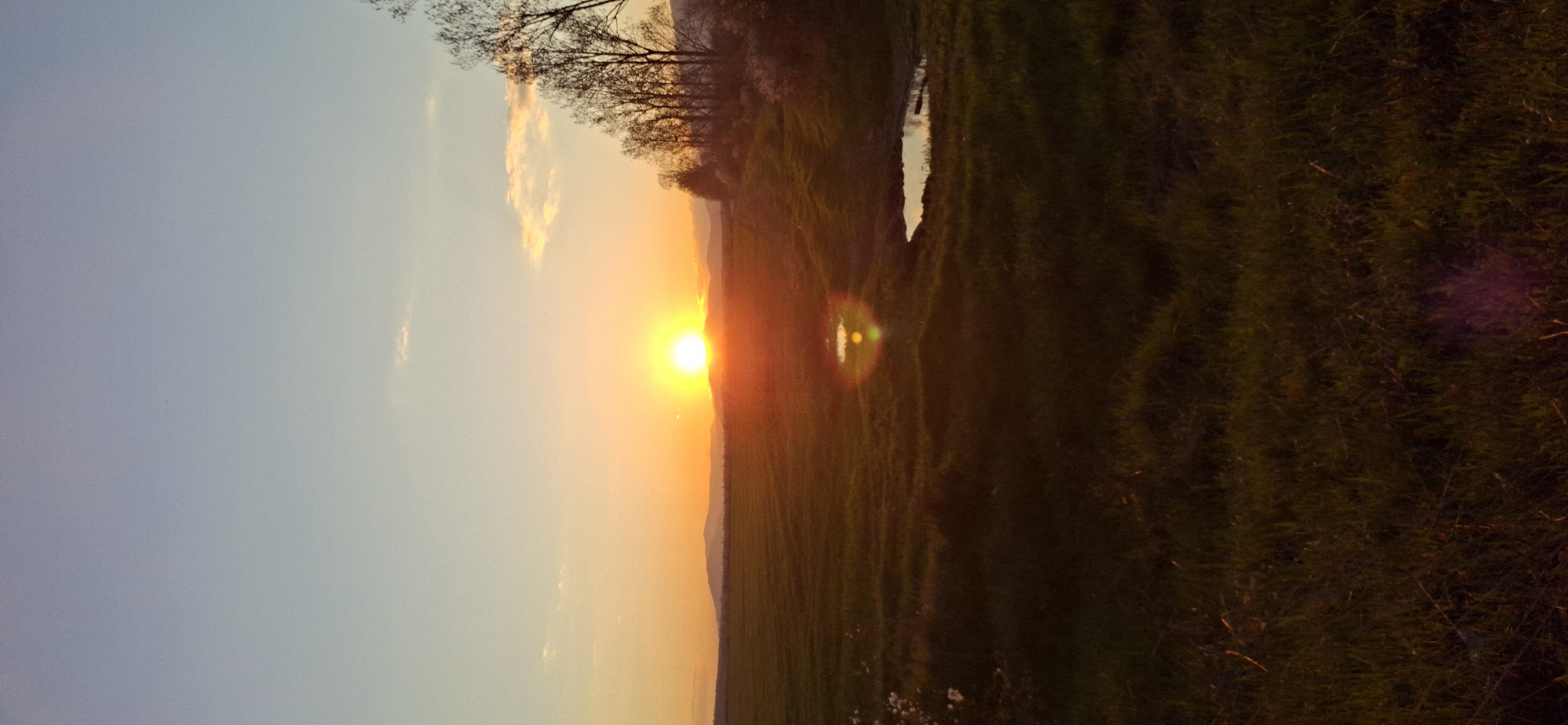 The image depicts a sunset over a landscape, likely a field or pasture, in Shivachevo, Bulgaria. The sun is positioned near the horizon, casting a warm orange and yellow glow across the sky and the ground. To the right of the sun, the land appears to be covered in dense vegetation, possibly grass or crops. A small body of water, possibly a pond or puddle, is visible within the vegetation. In the foreground, there is a patch of darker, possibly more overgrown, vegetation. In the background, a line of trees can be seen silhouetted against the sky. The sky transitions from a pale blue to an orange hue as it approaches the horizon.