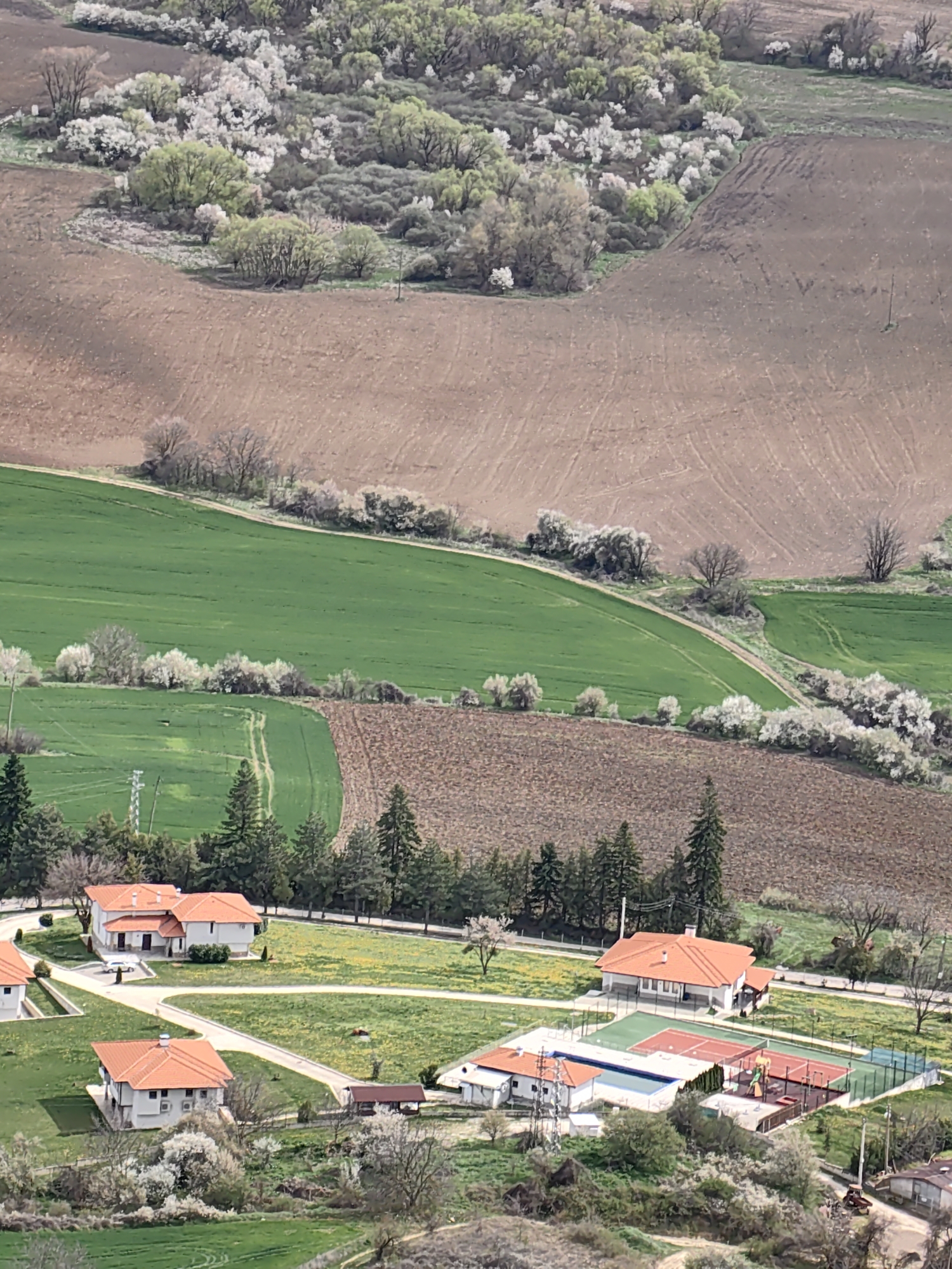 The image depicts a rural landscape near the city of Vrabevo, Bulgaria. Agricultural fields dominate the upper portion of the frame, with a mix of brown, cultivated soil and vibrant green fields of what appears to be young crops. Rows of flowering trees or bushes line the edges of the fields. The lower portion of the image features residential buildings with red tiled roofs, set among green lawns and more flowering trees. A tennis court and possibly a small playground are visible near one of the buildings. Tall coniferous trees are scattered throughout the scene. There are no people immediately discernible. A winding road or path connects the buildings.