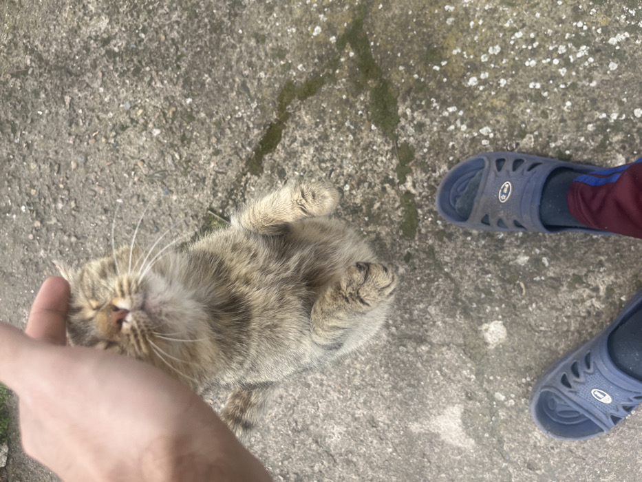 - "The scene, located in Pudria, Bulgaria, depicts a human interacting with a domestic cat on a grey concrete surface" by FM-88ou53, licensed under CC BY 4.0