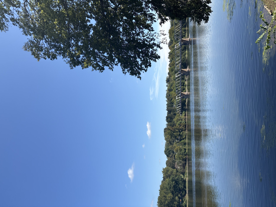 The image displays a daytime landscape scene overlooking the Delaware River, specifically featuring the Washington Crossing Bridge, viewed from the vicinity of Upper Makefield Township, Pennsylvania, United States. The upper two-thirds of the frame are dominated by a clear, bright blue sky containing a few small, scattered white cumulus clouds. The lower portion features the calm, dark blue-green water of the Delaware River, exhibiting visible patches of light green algae, particularly in the foreground. Spanning the mid-ground is the Washington Crossing Bridge, a multi-span steel truss bridge supported by multiple stone piers. The far riverbank is characterized by a dense line of green deciduous trees. A large tree with dark green foliage partially obstructs the view from the right side of the frame, extending from the top to the mid-ground. No individuals, vehicles, or specific actions are discernible within the scene.