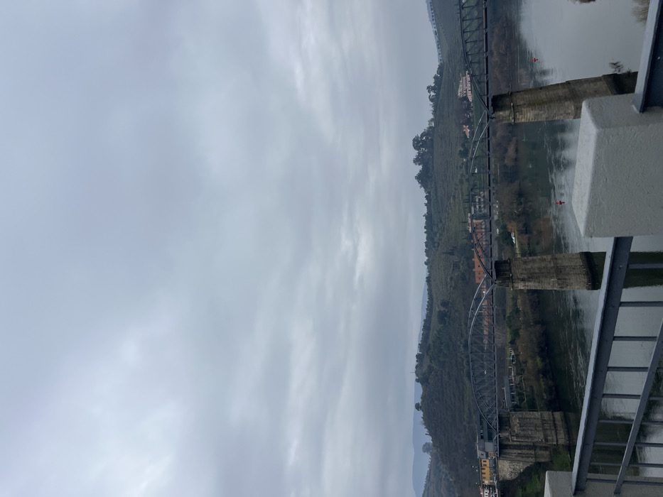 An overcast, wide-angle exterior photograph captures a panoramic view of the Douro River and its surrounding landscape in Peso da Régua, Portugal. The upper two-thirds of the image depict a uniformly gray, cloudy sky, suggesting an overcast day. In the foreground, a light-colored concrete railing with dark gray metal bars runs horizontally across the bottom of the frame, indicating the vantage point is from an elevated structure such as another bridge or a viewing platform. The midground features the Douro River, a calm body of dark, reflective water, flowing from right to left. Spanning the river is the Ponte Pedonal e Ciclável da Régua, a multi-span metal truss bridge, formerly a railway bridge. It consists of multiple arched metal segments supported by two prominent stone or concrete piers in the river, and at least one additional pier on the left riverbank. Two red conical navigation buoys are visible in the river, one closer to the left pier and another further to the right. The background reveals the riverbanks and hills. On the left bank, a cluster of multi-story buildings with varied facades (yellow, orange, white) lines the river's edge, ascending into the terraced hills. The hills are densely covered in green vegetation, indicative of vineyards, interspersed with trees. Similar terraced hills and a few lighter-colored buildings are visible on the right bank, extending towards the horizon. No individuals are visible in the scene.