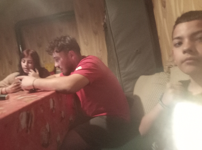 An indoor scene features three individuals seated, observed under dim, warm lighting with a prominent light source illuminating the right foreground. On the left, a female with reddish-brown hair and a light-colored top is seated at a table covered by a red, patterned tablecloth. She holds a smartphone in both hands and looks down at the screen, with her left hand near her face. Adjacent to her, a male with dark, curly hair and a beard is seated, wearing a red short-sleeved shirt with a white detail on the left sleeve and dark pants. He leans forward with his right arm resting on the table, directing his gaze towards the smartphone. A bracelet is visible on his left wrist. In the right foreground, a young male with short, dark hair and a light-colored shirt is partially visible and looking directly at the camera. He also wears a bracelet on his left wrist. The background features light-colored, possibly wood-paneled walls, and upholstered seating, including a dark gray/green padded surface and a light-patterned cushion. The specific location within Roman, Bulgaria, cannot be ascertained from the visual evidence.