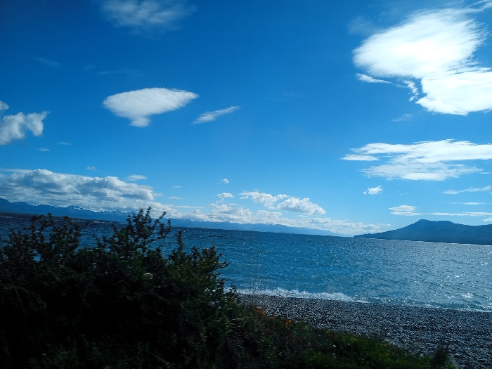 A bright blue sky dominates the scene, dotted with fluffy white clouds. Below, a large body of water stretches to the horizon, its surface rippling with gentle waves. A rocky shoreline meets the water's edge. In the foreground, dark green shrubbery obscures the view, creating a natural frame. Distant mountains are faintly visible, adding depth to the expansive landscape.