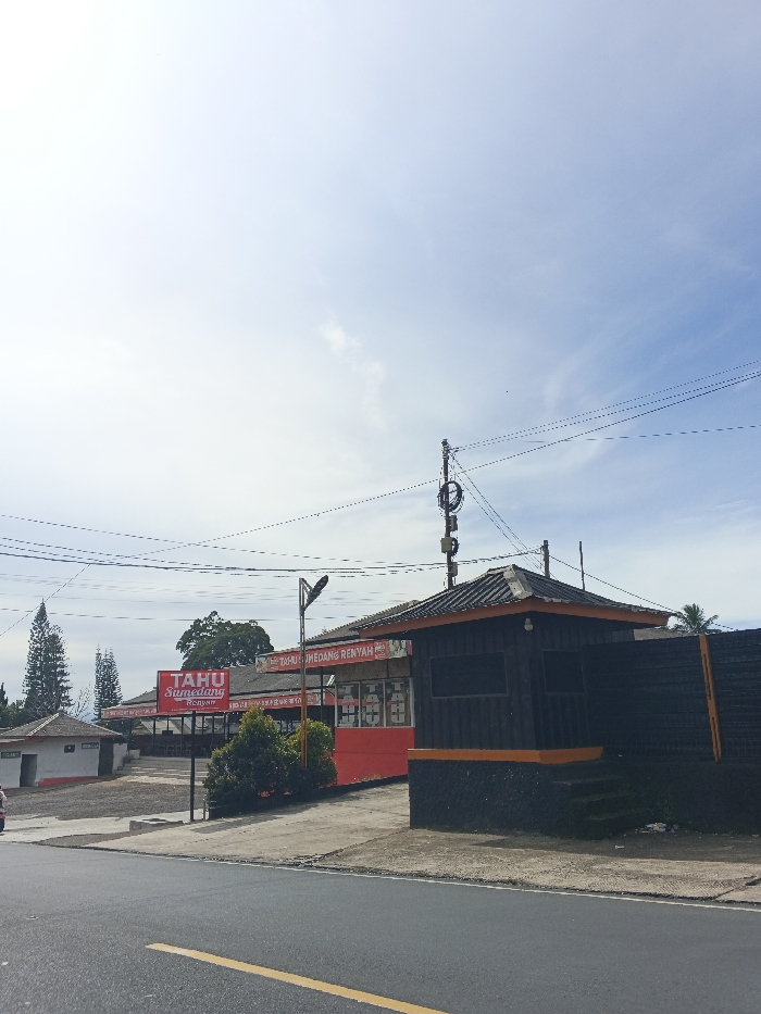 A street view under a bright, slightly cloudy sky features a restaurant with red and black signage, "TAHU Sumedang Renyah," visible. Adjacent to the restaurant is a dark-colored guardhouse-like structure with a peaked roof and steps. Utility poles and lines are overhead. The foreground shows a paved road with a yellow stripe marking the lane. The scene conveys a rural or suburban setting during daylight hours.