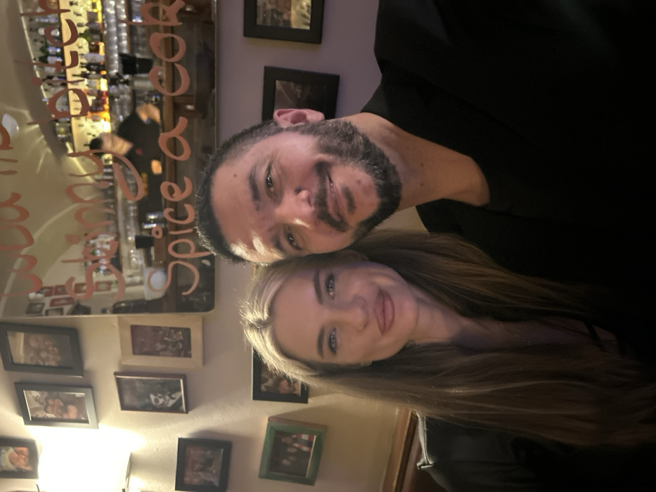 A man with a beard and a woman with long blonde hair pose closely together in a dimly lit room. Framed photos hang on the wall behind them, along with a mirror reflecting a bar area. The mirror has writing on it, partially obscured by the people in the foreground. Both individuals are looking at the camera and smiling slightly. The man is wearing a dark-colored shirt.