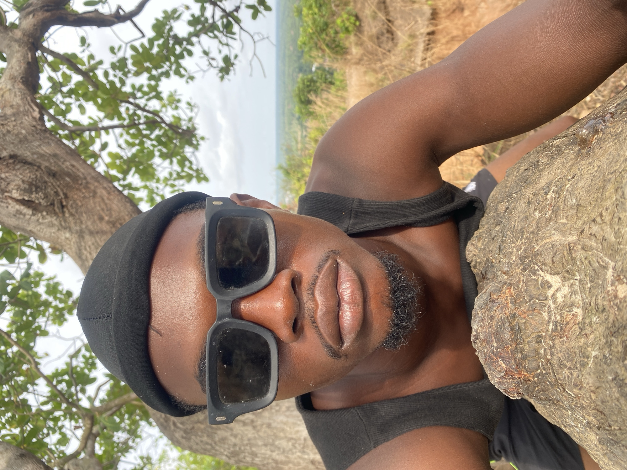A close-up, angled portrait depicts a dark-complexioned male in an outdoor, elevated natural setting in Achara, Nigeria. The individual is positioned behind a large, irregularly textured, dark brown and reddish-brown rock or tree root that occupies the lower foreground. He wears a black beanie, black square-framed sunglasses, and a black ribbed sleeveless tank top. A thin mustache and small goatee are visible. The background features a large tree trunk with green foliage against a cloudy sky. To the right, dry, yellowish-brown grass and dirt are visible, leading to a distant panoramic view of green, possibly forested, landscape under a cloudy sky.