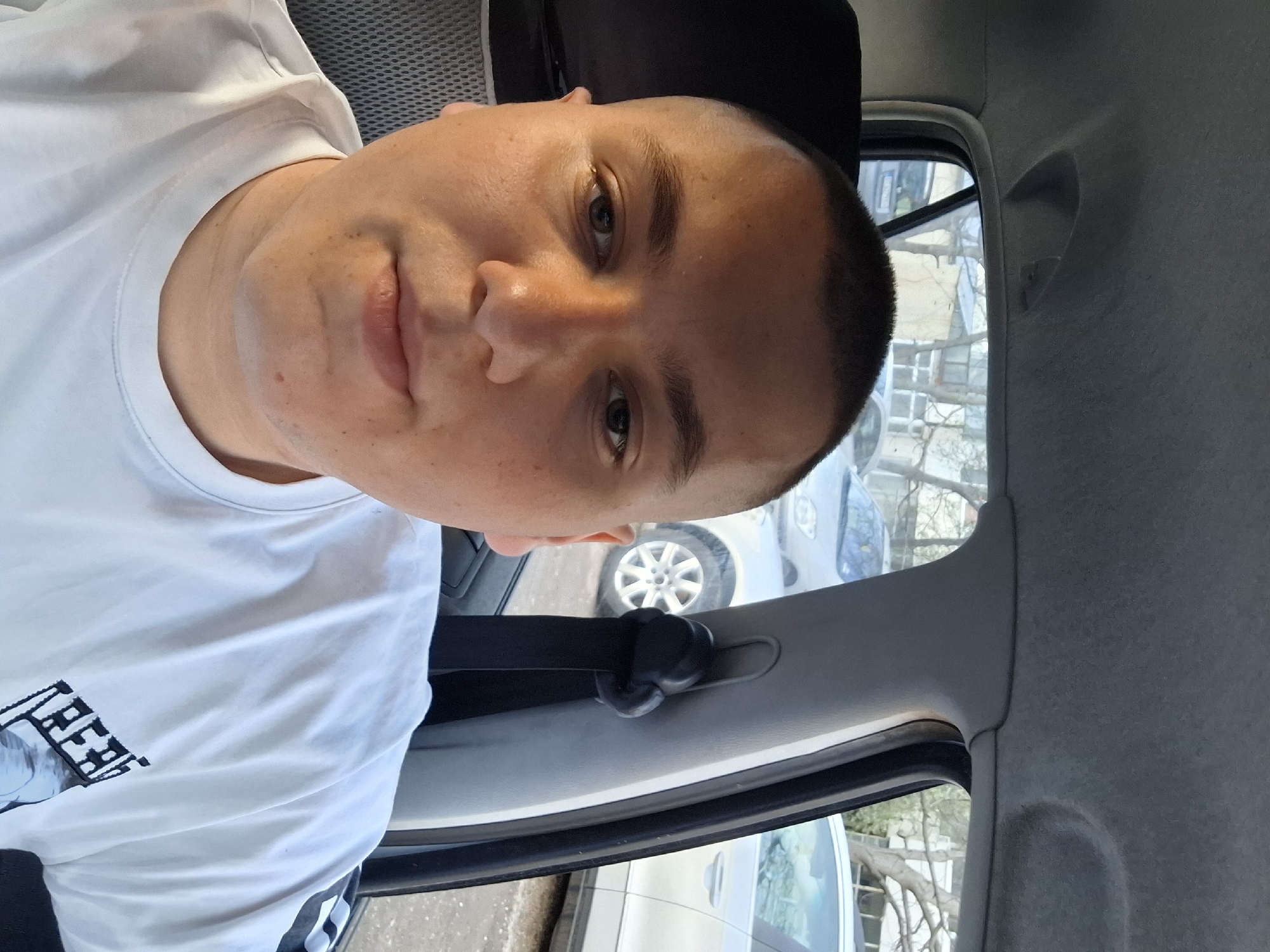 A light-skinned man with short hair sits in a car. He is wearing a white t-shirt. The car door is open, and a seatbelt is visible. Outside the car, other vehicles and trees can be seen. This image does not contain enough information to determine the location as the city of Lyaskovets, Bulgaria.
