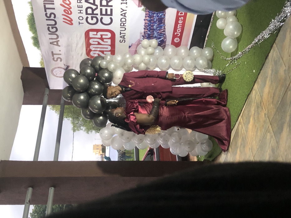 The image depicts an outdoor or semi-outdoor event scene in the city of Bar Gada, Nigeria. Two individuals, a female and a male, stand centrally, facing and looking at each other, suggesting an interaction. The female wears a long, deep maroon formal gown with ruffled shoulders and a sheer black long glove on her left arm; she holds a small pink portable fan in her right hand and has a gold, beaded adornment on her back/side. The male wears a maroon two-piece suit with a dark shirt and tie; he is smiling and holds a spherical, light-colored, possibly beaded clutch in his left hand. They are positioned in front of a decorative arch of white and dark gray balloons. Behind them is a large white banner with visible text including "ST. AUGUSTIN," "Welcome TO HER GRAND CEREMONY," "2025," and "SATURDAY, 19." A small image of individuals in academic regalia is visible on the lower right of the banner. The immediate ground beneath the subjects is covered with green artificial turf, adorned with silver tinsel or streamers. Beyond this, a paved surface is visible. To the far left, a blurred, dark figure partially obstructs the view. Structural elements, specifically a brown pillar with two horizontal metal bars, are visible on the left side of the frame. In the background, beyond the balloon arch and structural elements, a portion of a red vehicle is visible, along with green foliage and a light-colored building under a cloudy sky.