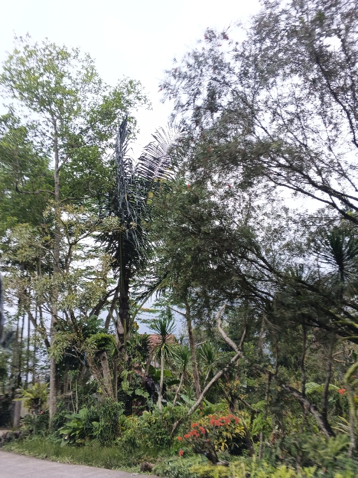 The image displays a dense tropical landscape, likely a roadside or garden in Vang Vieng, Laos, under an overcast sky. The foreground shows a grey paved surface on the lower left, bordered by short green grass and various low-lying plants, including some with reddish-orange flowers. The midground and background are dominated by a variety of mature trees and lush foliage. A tall palm tree with dark green, fanned fronds and visible clusters of small green fruits or flowers stands prominently near the center. To the left, several deciduous trees with lighter green, rounded canopies are observed. To the right, trees with finer, dark green foliage, some bearing small red blossoms, extend across the frame. Partially obscured by the dense vegetation in the mid-ground, a structure with a reddish-brown tiled roof is discernible. No people, animals, or specific actions are present within the scene.