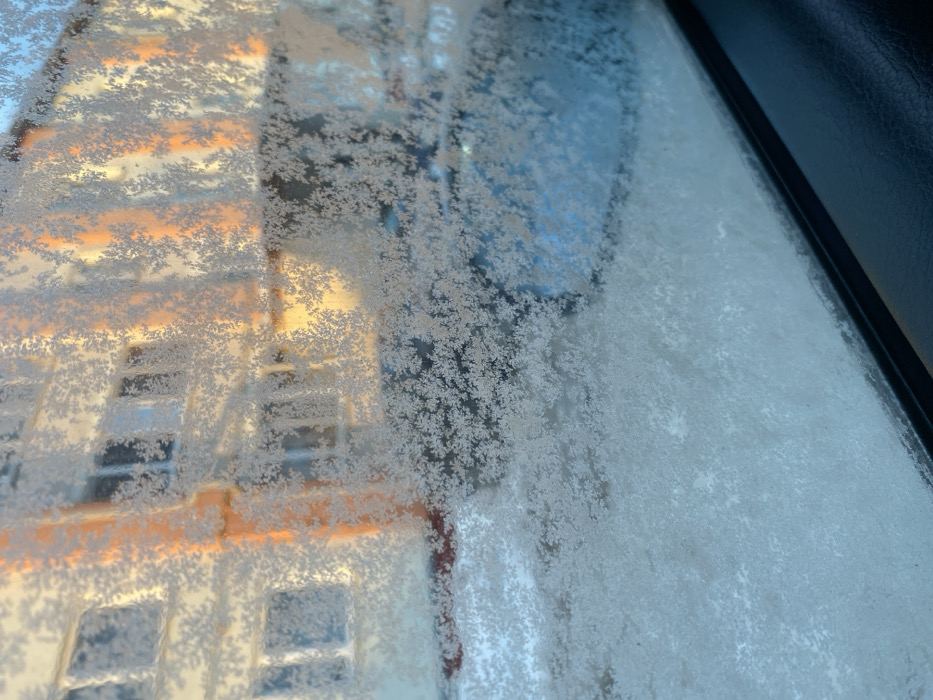 A frosted window partially obscures a view of buildings with visible window patterns. The frost forms delicate, snowflake-like patterns across the glass, varying in density, with more dense frost obscuring the building more. Light shines off the building's exterior, giving it a warm, yellowish glow. A dark edge of the window frame is visible in the upper right corner. The frost thins out towards the right side of the window, giving a more clear view through the glass.