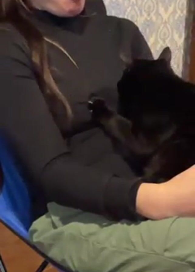 A woman is sitting in a blue folding chair. She is wearing a black long-sleeve shirt and green pants. She has long brown hair. She is smiling and looking down. A black cat is sitting on her lap, facing away from the camera. The cat is kneading her chest with its paws. There is a wall with wallpaper behind them. Someone else enters the frame briefly, but they are out of focus.