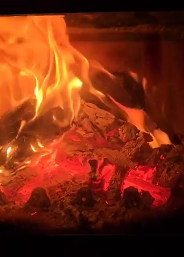 A wood-burning stove with glass door is seen in close-up. Logs and embers glow with orange and red fire inside.