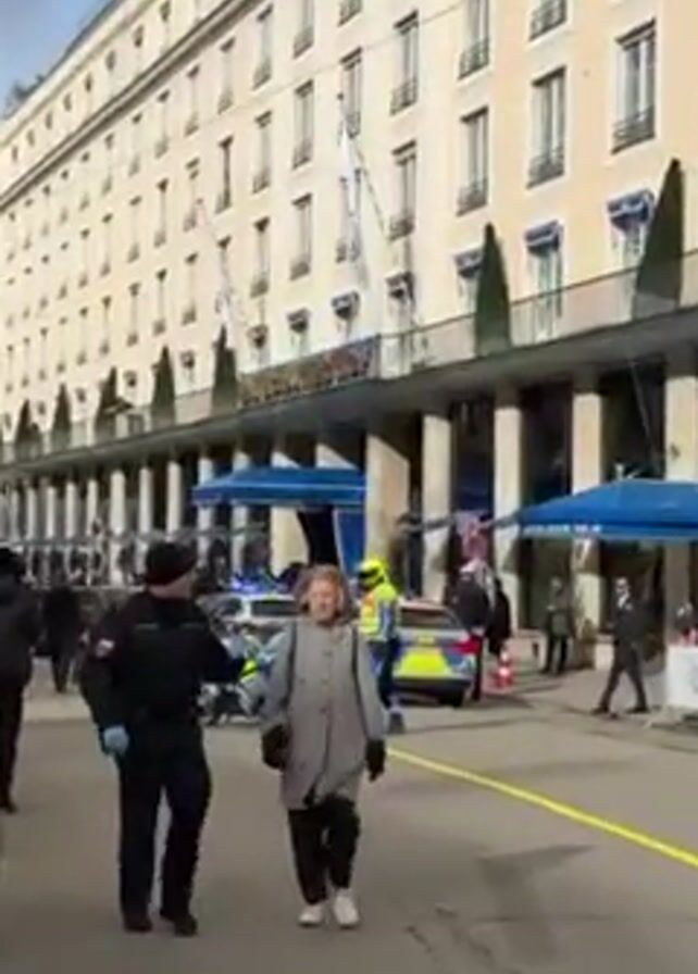 street in front of a large, multi-story building with a blue awning and the name "BAYERISCHER HOF" displayed above the entrance. Several people are walking on the sidewalk and along the street. A police officer in a dark uniform is walking alongside an older woman in a grey coat. The woman appears to have blood on her face, specifically near her nose. Behind them, there are several police cars with flashing lights and a police motorcycle. A yellow line is painted on the road. The sky is overcast, and some bare trees are visible on the side of the street.