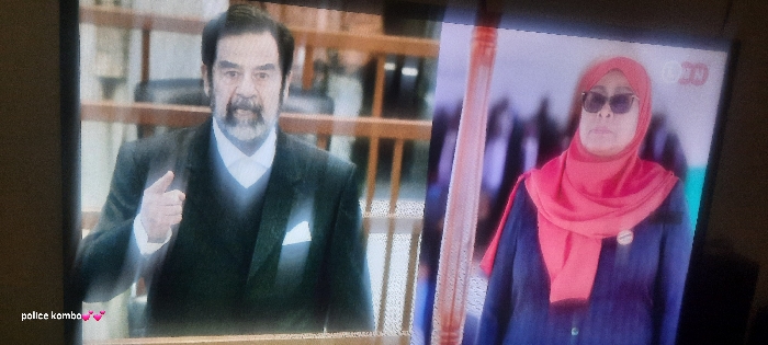 A photograph captures a television screen displaying a split-screen presentation. The left panel shows a male individual, identifiable as Saddam Hussein, from the chest up. He wears a dark suit, a white collared shirt, and a dark V-neck sweater, with a white pocket square. He has dark hair, a prominent mustache, and a beard, and is depicted mid-gesture with his right hand's index finger pointed forward. The background behind him features light-colored wooden architectural elements, suggesting an interior setting such as a courtroom. The right panel features a female individual from the waist up, wearing a red hijab, dark sunglasses, and a dark blue top with a circular badge affixed to her upper left chest. Her expression is neutral. The background behind her is out of focus, suggesting a public outdoor or well-lit indoor environment with indistinct figures. A 'QTV' channel logo is visible in the upper right corner of this panel. The presence of the 'QTV' logo, a former Kenyan television channel, indicates that the content is being displayed on a television located in Kenya, specifically inferred to be within the city of Nairobi. Overlaid text reading 'police kombo❤💕' is present in the lower-left corner of the overall photograph.
