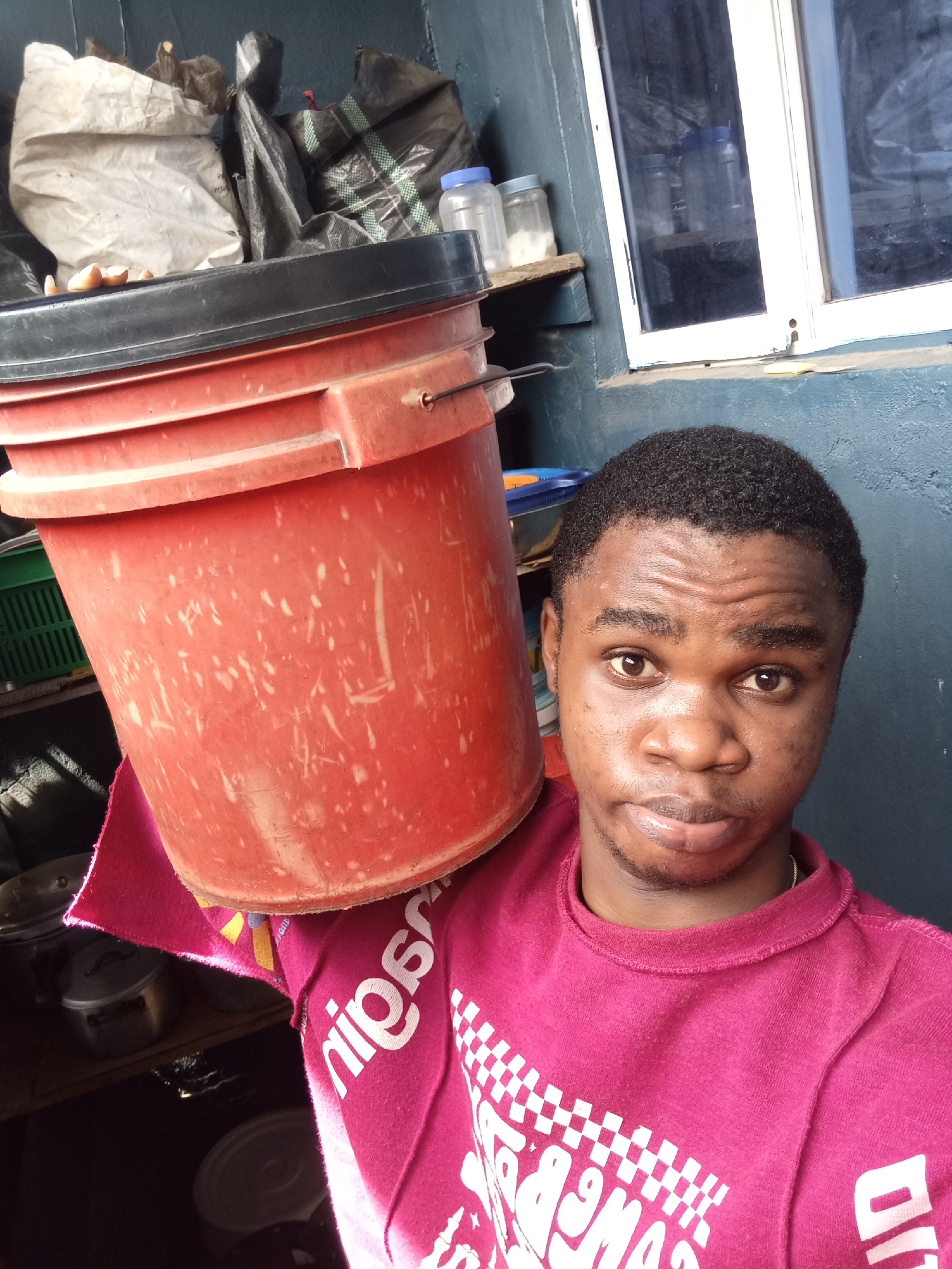 A young man stands indoors, holding a large, red, plastic bucket on his shoulder. The bucket has a black rim and appears heavily used with scuff marks. The man has dark hair and skin, and he wears a pink sweatshirt with white lettering and designs. The environment is somewhat cluttered. Behind the bucket, there are shelves with various items, including bags, containers, and cooking pots. A window is visible on the right side of the frame, partially obscured by curtains or a frosted appearance. The walls are painted a muted blue. The scene appears to be in a residential or storage area within the city of Owerri, Nigeria.