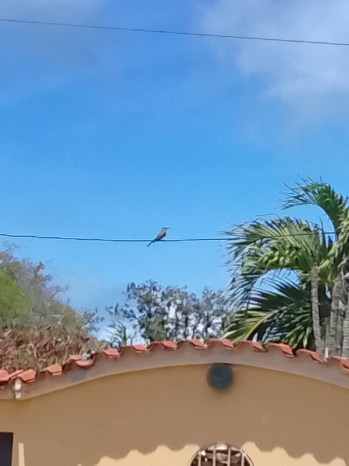 An outdoor scene in Altagracia, Venezuela, is depicted under a bright blue sky with sparse white cloud cover. A single light-colored bird, appearing brownish-gray, is perched facing left on a dark utility wire that spans horizontally across the upper-middle section of the image. Below the wire, diverse vegetation is visible, including green and reddish-brown trees and foliage in the mid-ground, with a prominent palm tree featuring green fronds on the right side. The foreground consists of a light orange-tan building wall topped by a red-tiled roof with a distinct undulating profile. A circular, dark-colored fixture is mounted on the building wall just below the roofline, and a portion of a window with decorative metal grating is visible at the bottom-center of the frame.