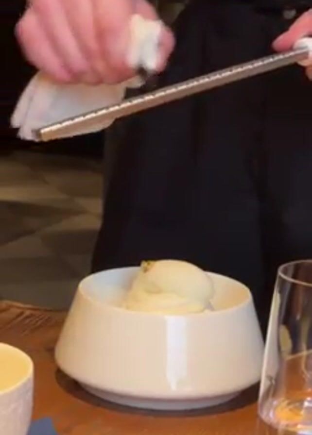 A waiter is grating something white onto a scoop of white dessert
