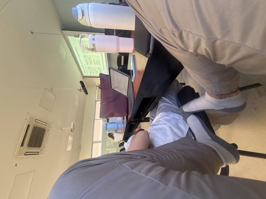 A classroom setting features two individuals seated at a desk. A laptop, tablet, water bottles, and a large bag are on the desk. A projection screen displays a lecture. The room has a ceiling-mounted projector and air conditioning unit. One person is wearing grey pants and white socks, while another, presumably a student, is wearing a white coat and sits partially obscured. The perspective is from an elevated angle, suggesting someone is seated behind the desk.