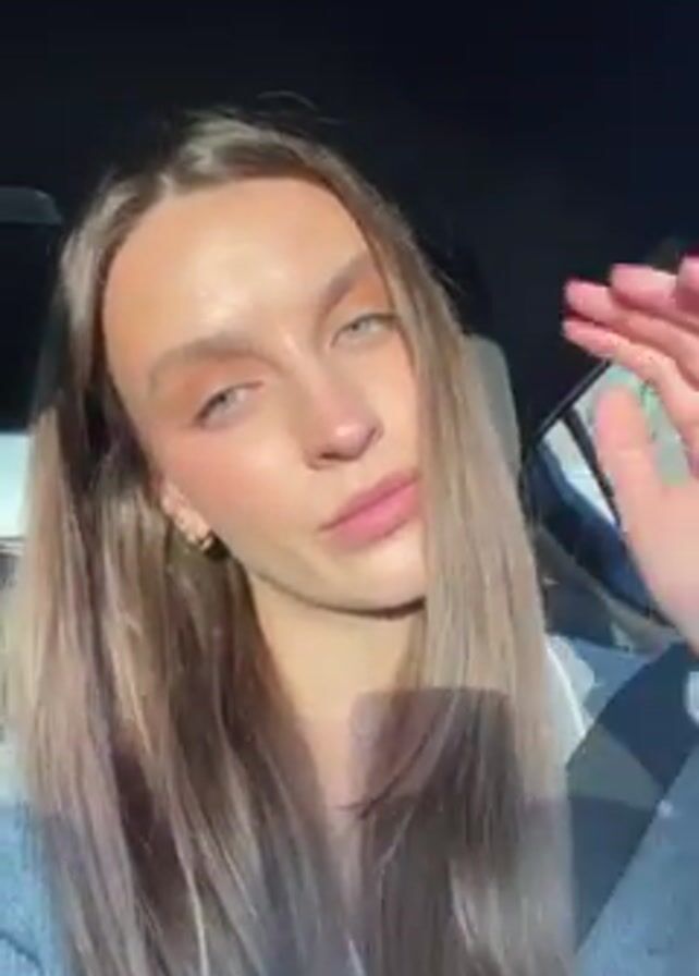 A light-skinned woman with long, light brown hair and blue eyes sits in a car