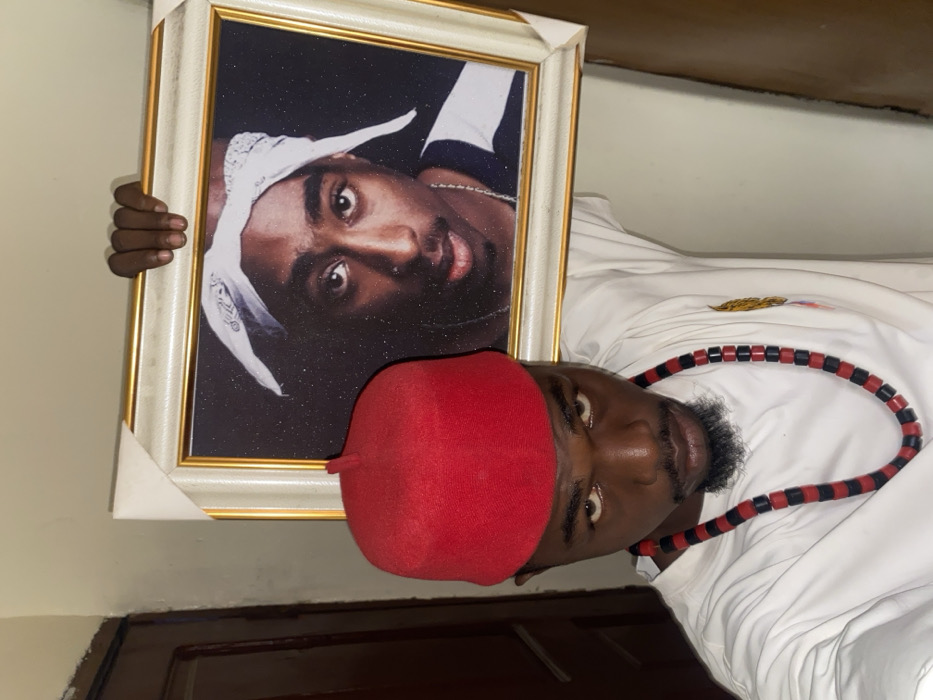 An adult male, dark-skinned, with a beard and mustache, is depicted indoors in Alaiyabiagba, Nigeria. He wears a red, cylindrical cap and a white garment, accessorized with a necklace of alternating red and black cylindrical beads. The man exhibits a direct gaze towards the camera. With his right hand, he holds a gold-framed portrait of Tupac Shakur, featuring his face and a white bandana, positioned above and slightly behind his head. The framed image includes a white inner border and a white protective corner on its upper right. The background consists of a plain, light-colored wall and a dark brown door frame visible on the left.
