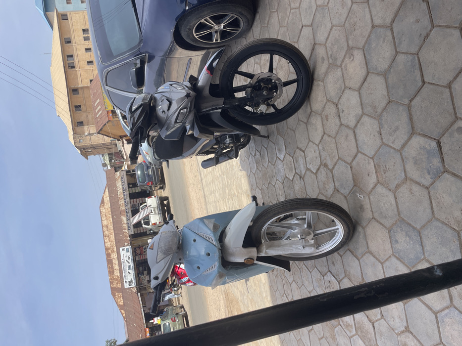 This image captures a street scene in Jos, Plateau State, Nigeria, in front of the commercial establishment "M&C SUNNY COMPUTERS LTD." on a bright, clear day. In the immediate foreground, two motorcycles are parked on a sidewalk paved with hexagonal concrete tiles. The motorcycle on the left is predominantly light blue and white, appearing new with protective plastic wrapping visible on its front fender and other components, and features silver spoked wheels. To its right, a dark grey/black motorcycle with a sportier design is parked, equipped with black spoked wheels and a front disc brake. A dark blue sedan is partially visible behind the grey motorcycle on the right. Across a paved road, a row of commercial buildings forms the mid-ground. A prominent single-story building features a heavily rusted corrugated metal roof and displays signage for "SUNNY COMPUTERS & [unclear text]" and "M&C SUNNY COMPUTERS LTD." A white pickup truck with a ladder secured in its bed is parked directly in front of these shops. Other vehicles, including a dark sedan and a light-colored compact car, are also visible on the street. Several indistinct human figures are present on the street and near the shops in the background, appearing to be walking or standing. Further in the background, multi-story buildings with light beige or brown facades and yellowish roofs are visible against a clear, bright blue sky. The scene depicts an active urban commercial area.