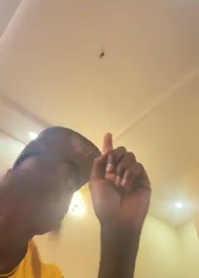 A medium shot presents a young man looking upwards at the camera. He is wearing a yellow shirt with black accents on the sleeves and a brown baseball cap. He is positioned slightly below the camera. He brings one hand up to his face, examining his fingers, then moves his hand back down. Behind him, the ceiling is visible, featuring a flush-mounted light fixture and a small, dark object that appears to be a bug. The overall lighting in the room is warm.