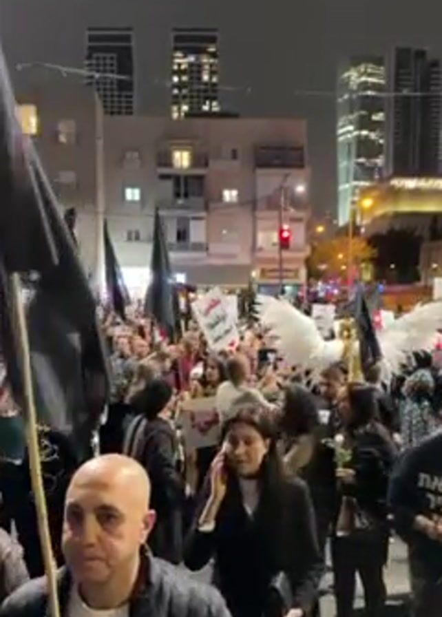 The video captures a street-level view of a nighttime protest. A crowd of people, mostly dressed in dark clothing, fills the street. Many are holding black flags, while others carry signs with text in Hebrew. Some protesters carry large, decorative white wings. The surrounding environment includes city buildings, some tall skyscrapers. The overall scene suggests a serious, organized demonstration taking place in an urban setting.