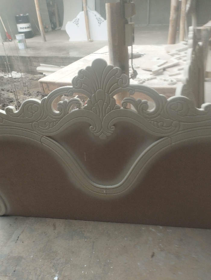 The image displays a workshop or manufacturing area featuring a partially finished, ornate furniture component in the foreground. This component, likely a headboard or footboard, is primarily light brown, possibly MDF, and features an off-white, intricately carved-look crest at its upper edge. Subtle lighter spray paint marks are visible on its main brown surface. The item rests directly on a gray concrete floor. In the background, a semi-enclosed workspace is visible. To the left, a dark barrel labeled "neomix" is present, alongside a red-handled broom and other containers. Bare tree branches or sparse vegetation are visible beyond this. To the right, a light-colored workbench or table is covered with numerous smaller, white, carved-detail furniture pieces. Further back, wooden support beams are discernible, and additional white furniture components are leaned against a background structure. The ground in the background appears to be a mix of dirt and paved areas. No individuals are present in the scene, and no actions or interactions are depicted. The image contains no discernible features or specific identifiers to establish its precise location within the city of Andijan, Uzbekistan.