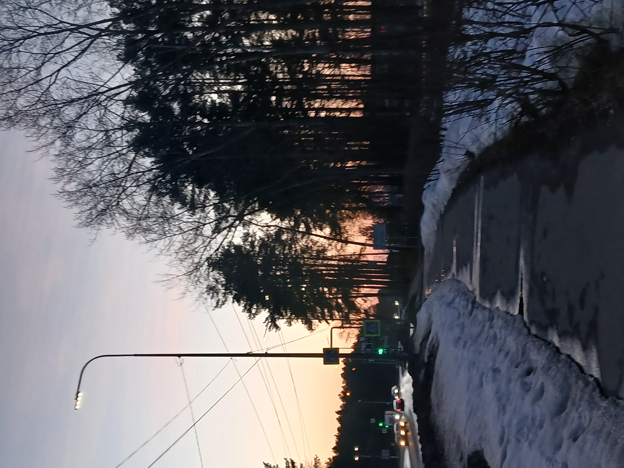 view down a road in Chaikovsky, Russia at dusk or dawn. The road is lined with trees on both sides, with some patches of snow remaining on the ground. Streetlights are visible, and there is a traffic light showing green. Cars are present on the road. The sky is a gradient of colors from pink/orange near the horizon to gray/blue above. Bare tree branches are visible against the sky.