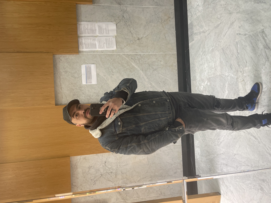 A male individual, approximately 25-40 years old with a beard, takes a mirror selfie in an indoor setting within the city of Meknes, Morocco. He is positioned centrally, directly facing the camera. He wears a black baseball cap, a dark-colored turtleneck or hoodie, a dark blue denim jacket with white sherpa lining visible around the collar and front, distressed dark grey jeans with visible rips at the knees, and black and blue high-top sneakers. His right hand holds a black smartphone, reflecting in the mirror, while his left hand is placed in his jeans pocket. A silver chain bracelet adorns his left wrist, and a silver ring is on his left ring finger. The environment features a light grey and white polished marble floor, which extends up to form the lower portion of the walls. A thin, dark horizontal strip separates the marble wall section from the floor. Above the marble, the upper walls are covered with light brown wooden panels. Two white rectangular documents, one appearing as a table or list and the other with text, are affixed to the marble wall on the right side. A vertical wooden structure or door frame is partially visible on the far left.
