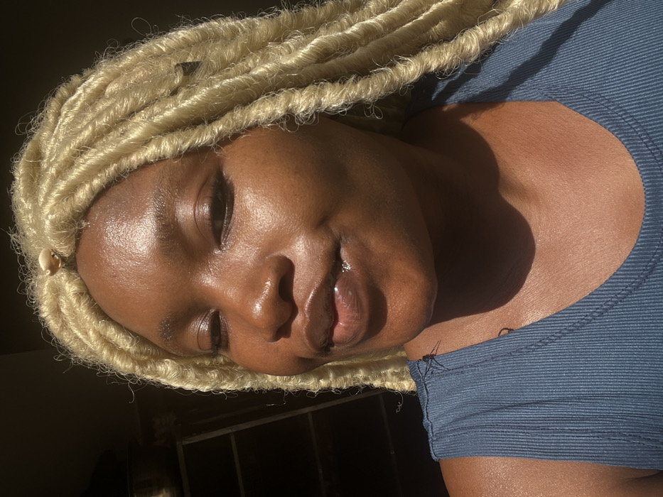A close-up photograph depicts an adult female individual with dark skin and blonde faux locks, styled with a light-colored bead near the forehead