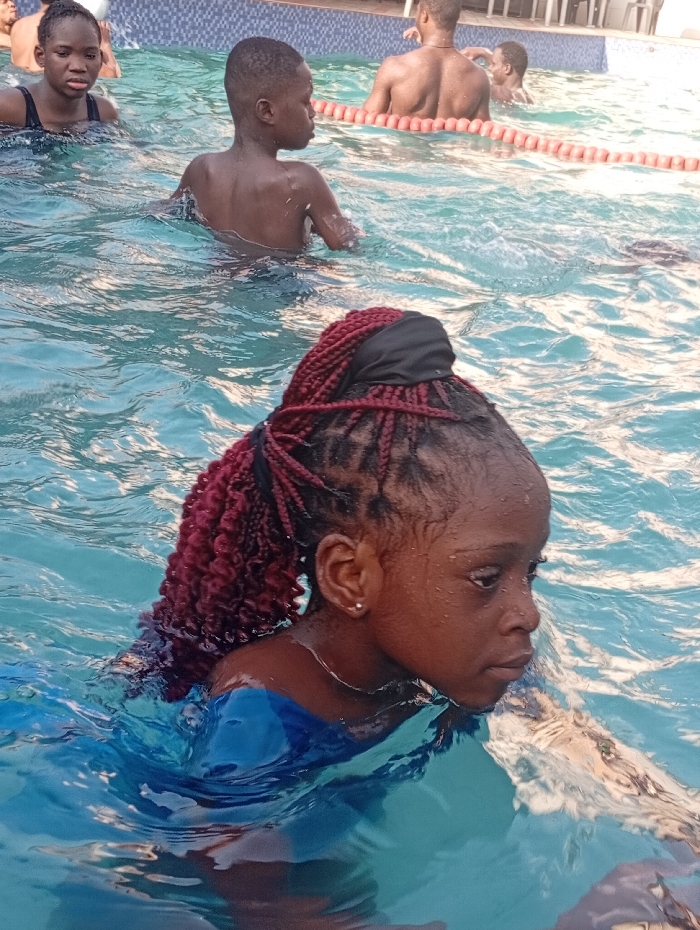 A young girl with red-brown braided hair and a blue shirt is in a swimming pool, looking to the right. Other children and an adult are also in the pool, with a lane marker visible in the background. The pool is bordered by tiled walls.