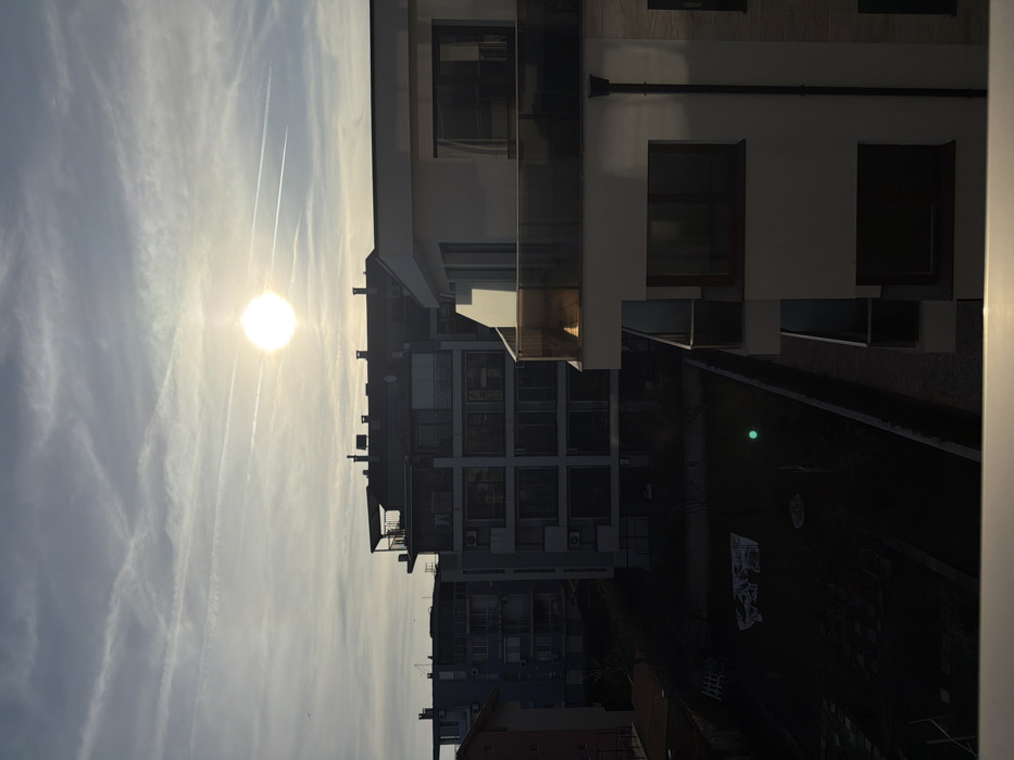 The image depicts an outdoor urban environment in Burgas, Bulgaria, captured from an elevated perspective. The scene is illuminated by a bright, low sun, positioned centrally in the upper half of the frame, creating significant glare and deep shadows. The sky exhibits scattered clouds and multiple crisscrossing white contrails from aircraft. In the foreground right, a modern, multi-story building with white facades features several levels of balconies equipped with dark-tinted glass railings and large windows. Reflections are visible on the surfaces of the upper balconies. A dark downspout extends vertically down the building's side. Behind and to the left of this structure, a taller, darker grey building with a grid-like arrangement of windows and balconies is prominent. Several air conditioning units are affixed to its exterior. Further in the background left, another building with a light blue-grey facade is partially visible. Below the buildings, a dark, shaded ground area, appearing to be an undeveloped plot or yard, contains indistinct objects, possibly white tarpaulins or debris. A distinct green circular light anomaly, consistent with lens flare, is visible within this dark ground area. The bottom edge of the frame is occupied by a blurry, light-colored horizontal surface, consistent with a window sill or balcony railing. No individuals are present in the scene, and no overt actions or interactions are occurring.
