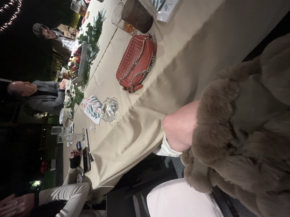 The image depicts an outdoor night scene at a gathering in Naucalpan de Juárez, Mexico. The central focus is a long rectangular table draped with a beige tablecloth, around which several individuals are seated. **People:** * In the foreground, the perspective is from a seated individual whose bare knee and lower leg are visible, along with a portion of a brown faux fur coat or blanket covering their lap. This individual is wearing white and gray striped socks. * To the left, a person's left arm and hands are visible. This individual wears a cream-colored ribbed long-sleeve top and has two rings on the fourth finger of their left hand. Their hands are raised near their face. * In the mid-ground, a bald, older man with a beard is seated, wearing a light grey blazer over a black turtleneck. He is looking towards the left side of the frame. * Further down the table on the right, a younger man with dark curly hair is visible, wearing a light brown jacket over a white collared shirt. He appears to be looking downwards. **Subjects & Objects on the Table:** * The table is set with various items. A centerpiece runs down the middle, featuring green garlands (eucalyptus and fir-like branches) and a wooden trough filled with red and gold ornaments/fruit. * Multiple clear drinking glasses, some appearing empty and one containing a dark beverage (possibly iced tea or an alcoholic drink), are present. A dark textured glass is also visible. * A transparent hexagonal glass ashtray contains a cigarette butt and ash. * Near the ashtray, a white fabric napkin with a green and orange leaf pattern is partially folded. * Two smartphones are placed on the tablecloth near the person on the left, one dark-colored and one lighter. A blue and white cigarette pack is also present. * A distinctive red rectangular purse with silver stud embellishments and a silver chain strap rests on the tablecloth near the right side of the ashtray. * Small white rectangular objects, possibly small dishes or cards, are scattered. **Environment:** * The scene is outdoors at night, indicated by the dark background and visible string lights overhead, suggesting a patio or garden setting. * Green foliage and potted red flowers are discernible in the soft focus background. * The overall lighting is dim, provided by the string lights and ambient sources, casting soft shadows. **Actions & Interactions:** * Individuals are seated around the table, suggesting a social gathering, meal, or conversation. * The person taking the photograph is seated at the table. * No direct active interactions between visible individuals are captured, though their positions suggest a collective gathering.