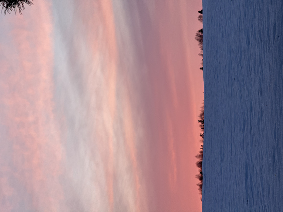 The image displays a panoramic winter landscape in Mishkino, Russia. The sky, occupying the upper two-thirds of the frame, features horizontal bands of clouds illuminated in shades of deep reddish-pink at the lowest visible point, transitioning to lighter pinks, oranges, and pale purplish-grey towards the top. A distinct, slightly undulating horizon line separates the sky from the foreground. Along this horizon, a sparse, dark silhouette of a tree line is visible, consisting of both bare deciduous trees and some coniferous trees. The lower third of the image is a snow-covered field, appearing in blue-grey tones, with subtle textures and undulations indicating drifts or uneven terrain on its surface. No individuals, animals, structures, or active elements are present in the scene.