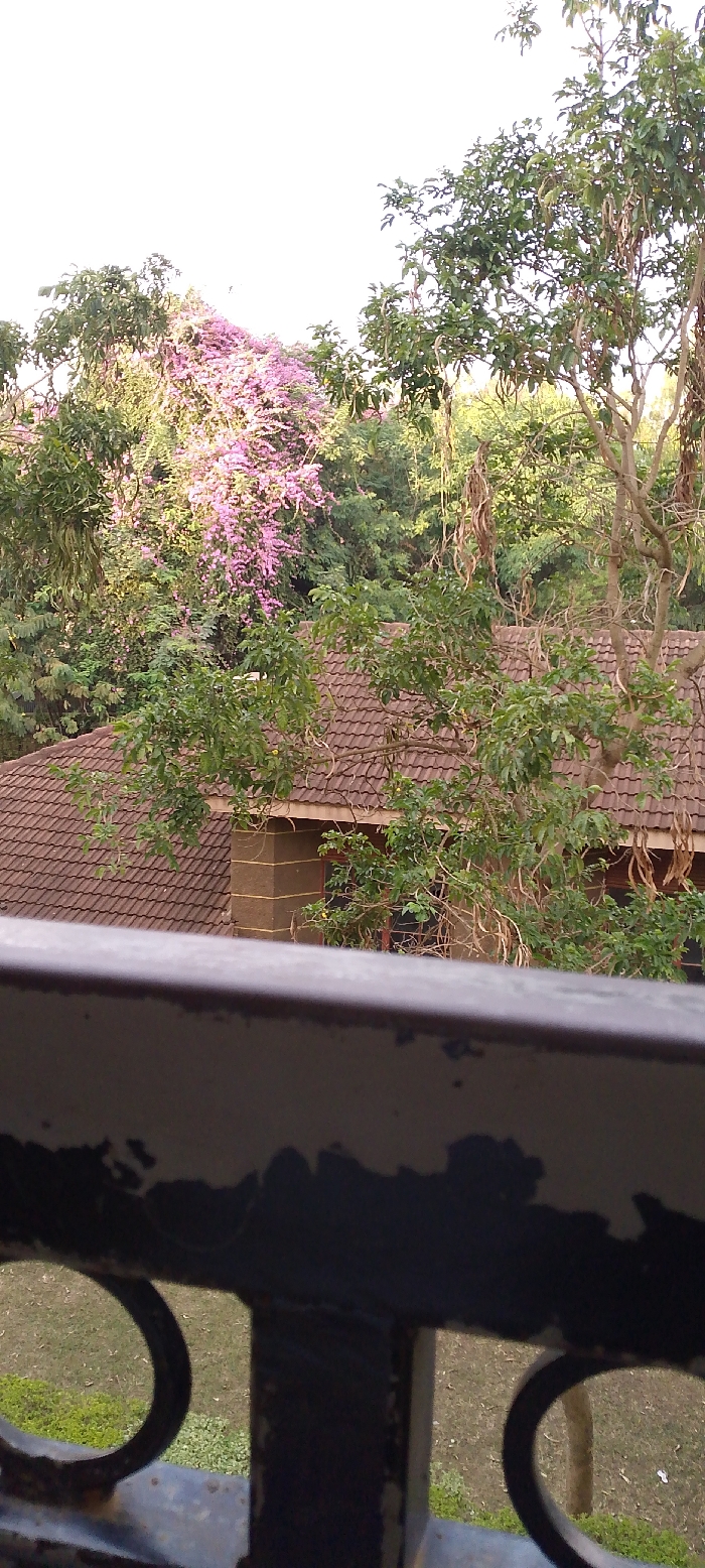 The image displays an outdoor scene in Bondo, Kenya, captured from an elevated perspective. In the immediate foreground, a dark-colored, weathered metal railing with circular structural elements is present. Beyond the railing, the reddish-brown tiled roof of a building is visible, partially obscured by an abundance of green foliage. A section of the building's exterior wall, characterized by a tan base color with darker horizontal banding, and a dark-framed window are discernible beneath the roofline. The midground and background consist of dense vegetation, including multiple trees with green leaves. A prominent tree or vine features extensive clusters of vibrant pink/purple flowers, while other trees exhibit dried, elongated seed pods. A patch of sparse grass, intermingled with greener areas, is visible on the ground through the railing. The upper portion of the frame shows a bright, uniform sky, suggesting overcast conditions or hazy daylight. No individuals are present, and no specific actions or interactions are depicted within the static scene.