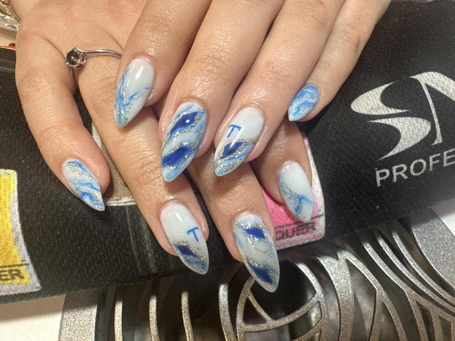 A close-up image displays two human hands, likely female, showcasing a fresh manicure. All ten fingernails are long, with an almond or stiletto shape, and feature a white base coat. Each nail is intricately designed with marbled patterns incorporating light blue, dark blue, and silver glitter. The index finger of the left hand and the ring finger of the right hand prominently display a dark blue stylized letter 'T' outlined with silver glitter on the white background. Other nails exhibit swirling light and dark blue patterns with silver glitter streaks. A silver-toned ring with a dark, circular stone is present on the ring finger of the right hand. The hands rest on a textured black fabric, which has text visible including "PROFESSIONAL" in white letters oriented vertically, a white stylized logo below it, and the partial word "ER" in pink above it. To the far left, a metallic, silver-colored object with a decorative, geometric cut-out pattern is partially visible. The indoor setting lacks specific landmarks or identifiable architectural features to pinpoint a precise location within Vratsa, Bulgaria.