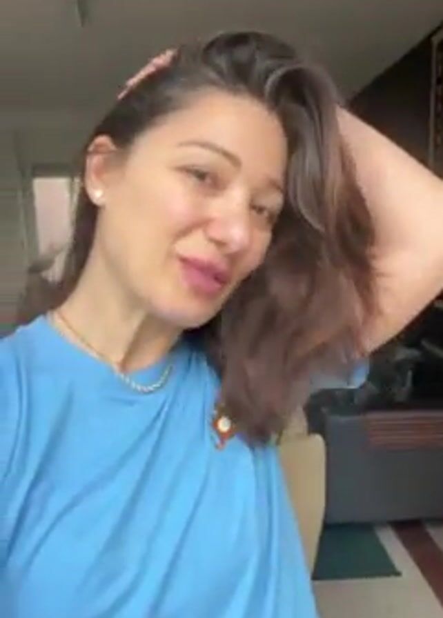 A woman in her 40s with medium brown hair with streaks of grey, is facing the camera indoors. She is wearing a light blue T-shirt with a squirrel design on the left. She is wearing some jewelry, a small gold necklace and silver chain. She is smiling and speaking to the camera. The background appears to be a living space with artwork and plants visible.