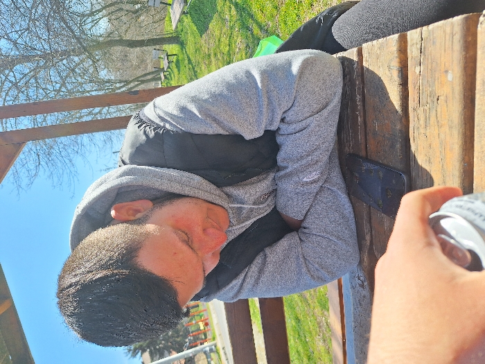 This image captures an outdoor scene in Katina, Bulgaria, on a clear, sunny day. A male individual, appearing to be a young adult, with short dark hair, is seated at a weathered wooden picnic table. He wears a grey hooded sweatshirt and a black sleeveless vest. His head is bowed, resting on his forearms, which are crossed on the table. A black mobile phone lies face-down on the table to his right. In the foreground, a hand holds a silver beverage can. The background features a grassy area with trees exhibiting sparse foliage, and several empty wooden benches. Distant structures, including a building and playground equipment, are partially visible on the far left. Wooden support beams of an overhead structure are present in the upper portion of the frame.