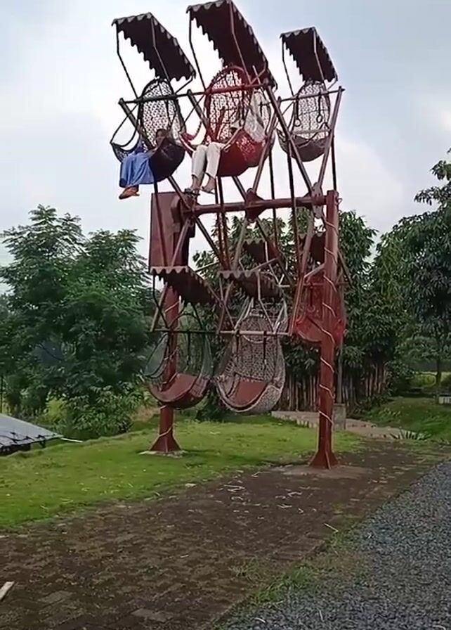 three people riding a stationary, non-motorized, rustic-style Ferris wheel on a cloudy day. The wheel is constructed of metal painted in shades of maroon and brown, featuring six individual basket-like seats arranged around its perimeter. Each seat has a protective awning above. The riders are casually dressed, two are in the upper seats and one in a lower seat. The wheel is situated on a grassy field with surrounding trees. A path made of gravel runs in front of the structure. The sky is overcast.