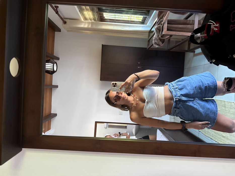 A woman in a white top and high-waisted denim shorts takes a mirror selfie